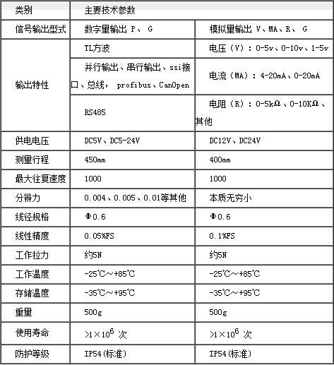 收線為原裝進口不銹鋼鋼絲繩,該鋼絲繩外層涂塑,抗腐蝕能力強、強度大、無伸縮;繞線彈簧機構采用進口不銹鋼材料生產,抗腐蝕,收線穩定。使其成為一款結構緊湊、安裝空間尺寸小、測量行程長、方便靈活、具有高精度測量的工控優選位移傳感器。